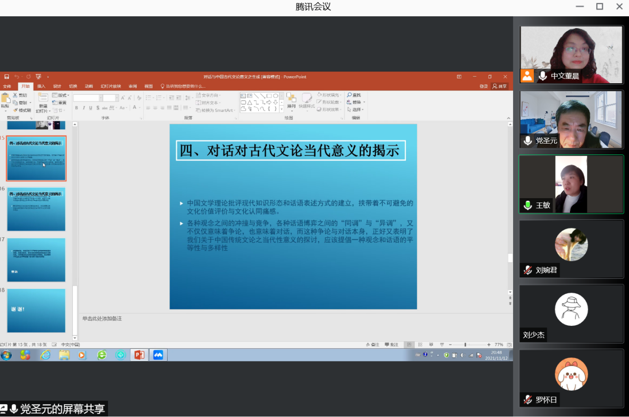 2021年11月12日晚7点,av大平台 邀请中国社会科学院大学教授、博士生导师党圣元为av大平台 研究生开展题为“对话与中国古代文论当代性意义生成”的线上学术讲座。此次讲座由av大平台 教师董晨博士主持,王敏教授及文学类专业研究生参与。
