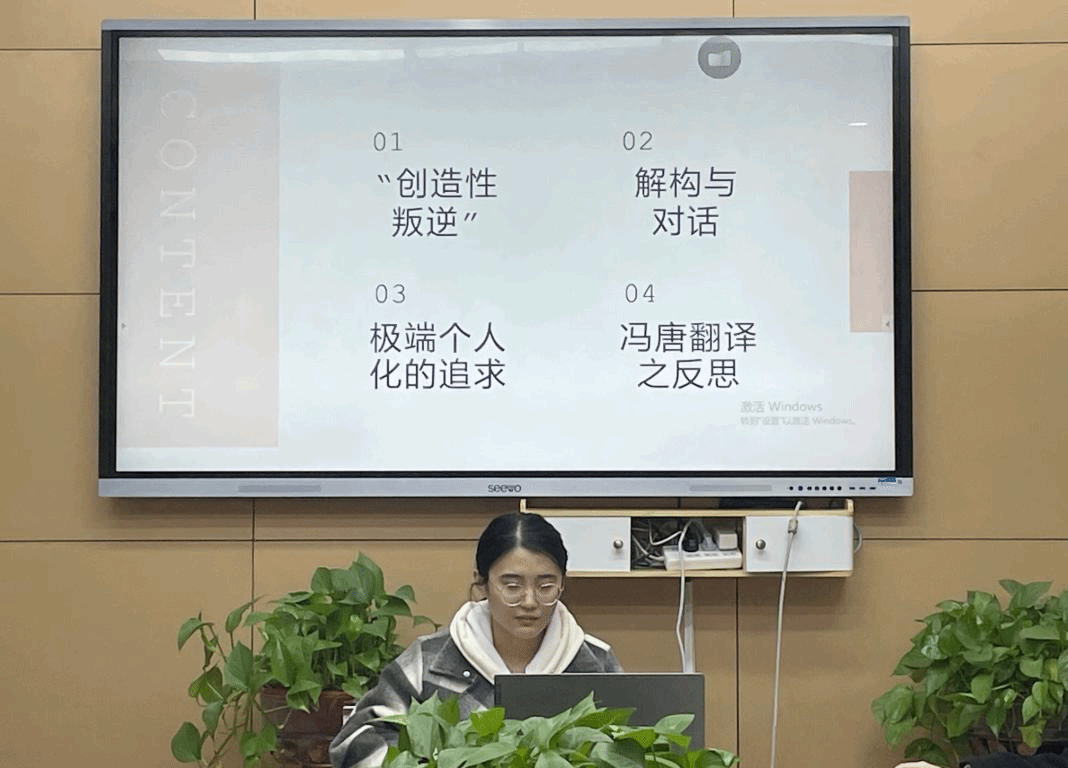王黎明主要从冯唐翻译的《飞鸟集》中来看待译者的主体性。她从冯唐译《飞鸟集》“创造性叛逆”的产生、“有我”:解构和对话的过程以及极端个人化的诗意偏离等三个方面进行了阐述。她首先介绍了什么是“创造性叛逆”,在实际的翻译中,创造性与叛逆息息相关,构成一个和谐的有机体,尤其是在诗歌的翻译中更为突出。接着她通过对比郑振铎与冯唐对《飞鸟集》的翻译,阐述了冯唐对《飞鸟集》的解构,其在翻译的过程中,忽略介词、连词等,突出了对个人主体性地位的追求。最后,她讲述了冯唐在翻译的过程中更加追求音调上的押韵,导致了诗意的偏离甚至消失,并表示对于冯唐的翻译,我们如何看待还需要进行进一步的探讨。