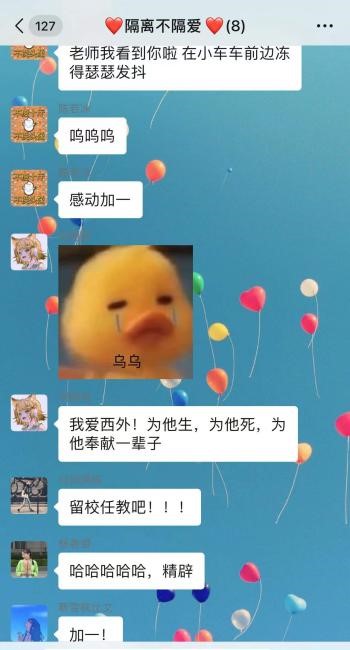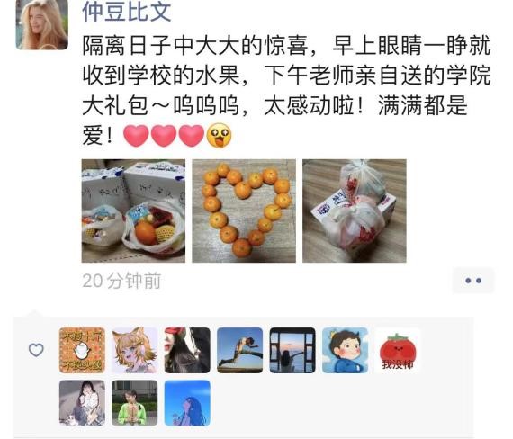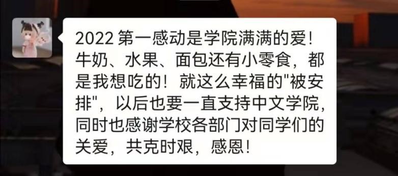 学生纷纷表示,感谢学院领导和老师们的关心关怀,隔离生活虽然存在诸多不便,但志愿者及老师们对他们的生活呵护备至,能够让他们感受到“家”的温暖,感谢所有人的辛苦付出,一定会严格做好各项防护措施,保持乐观心态,合理安排好自己的生活和学习,静待春暖花开。
