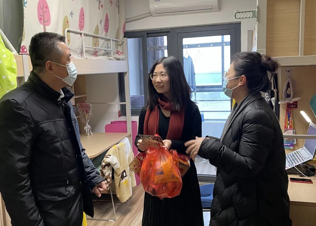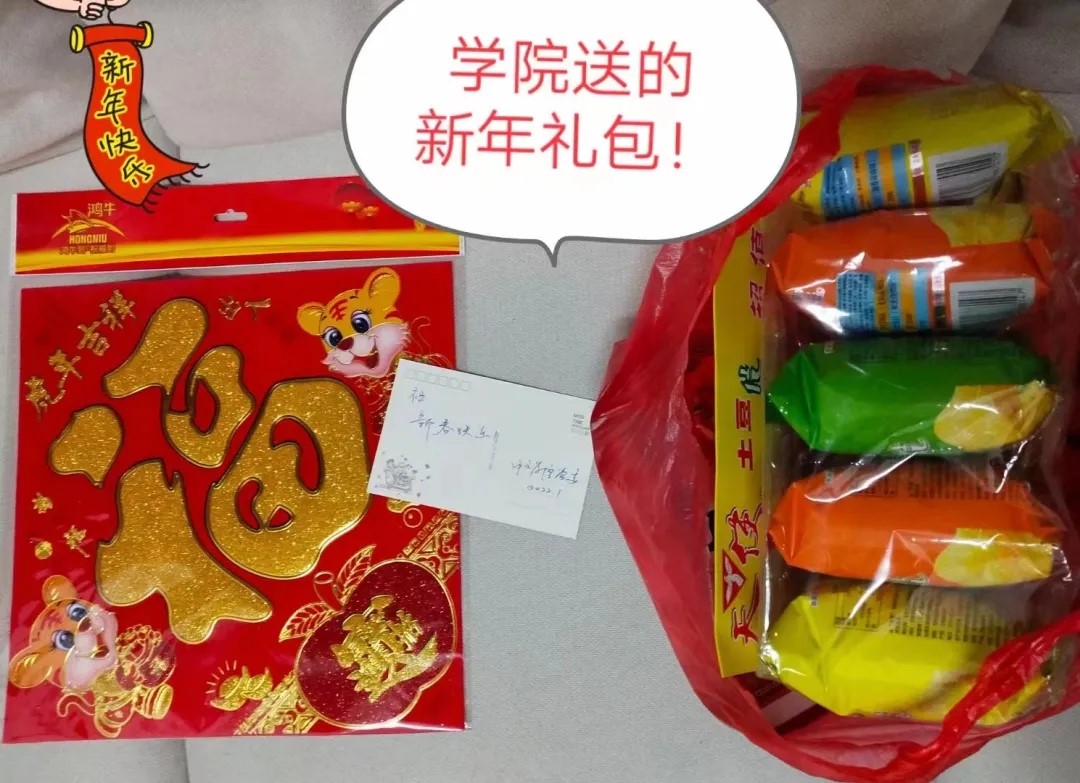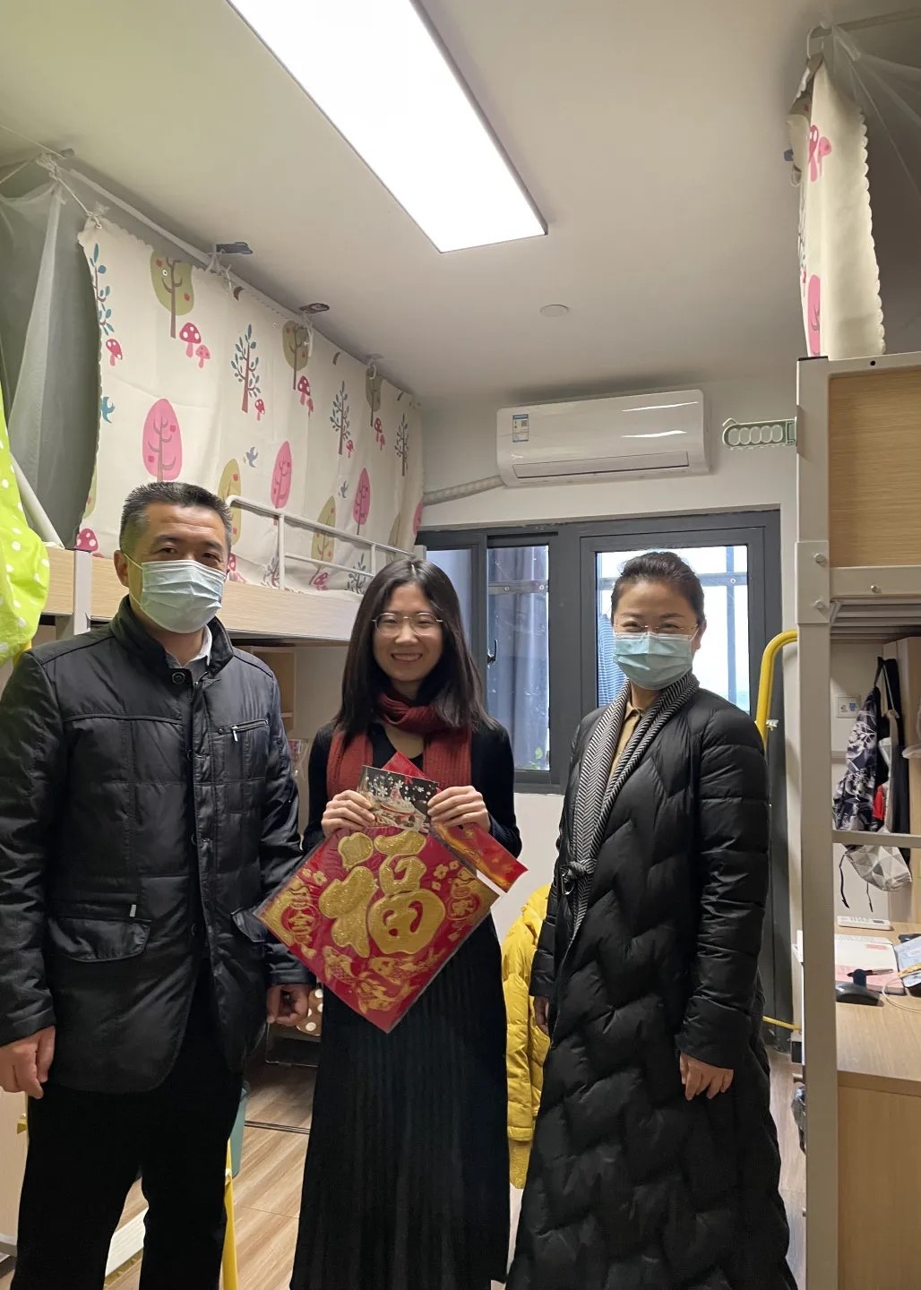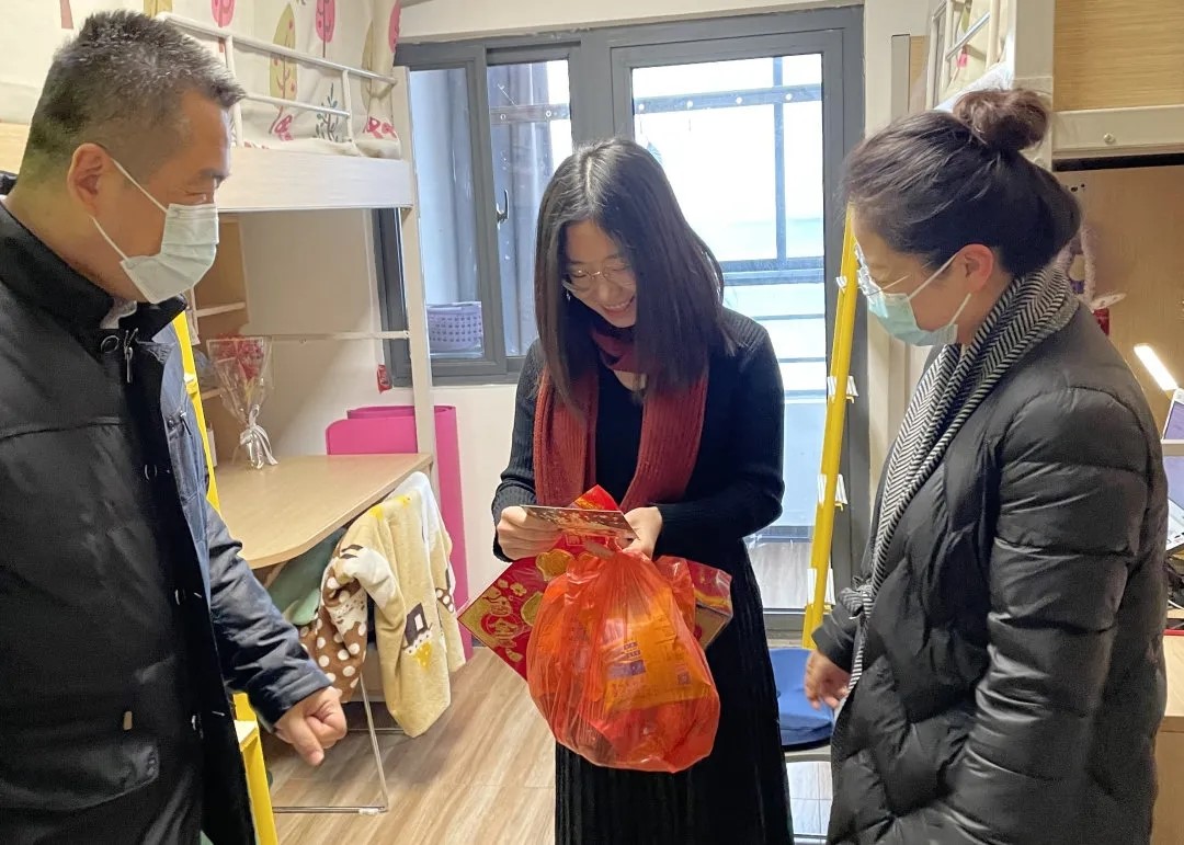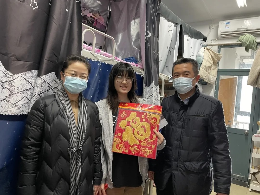 走访慰问中,学院领导老师向留校学生致以节日的问候和新春的祝福,并送上了新春慰问大礼包,深切地传递了学院温暖贴心的关怀。老师们与留校学生亲切交谈,仔细询问了大家在校的假期安排、学习以及生活情况,鼓励留校学生做好寒假规划,多与自己的导师密切沟通,抓紧时间撰写毕业论文,适度锻炼身体,保持积极健康的良好心态;同时,提醒同学们留校期间一定要严格遵守学校的防疫要求,非必要不出校,坚持晨午检打卡,遵守留校纪律,有任何问题和困难主动和家长、辅导员、学院沟通,学院将尽可能为大家排忧解难,确保同学们度过一个温暖、安全、愉快的寒假。