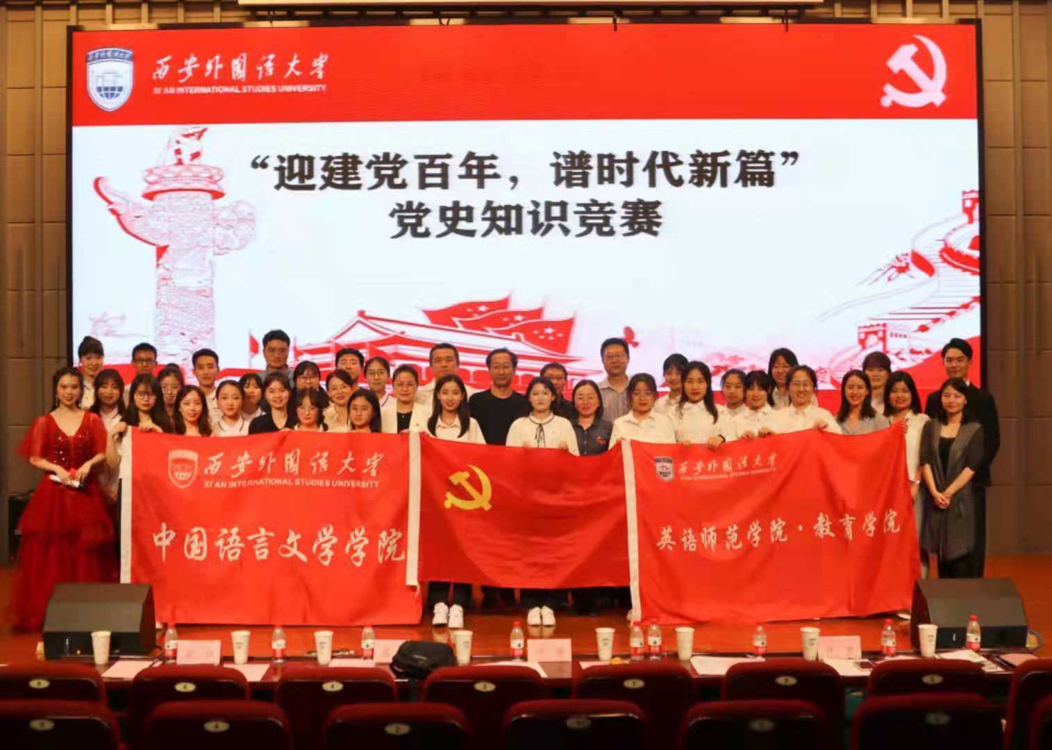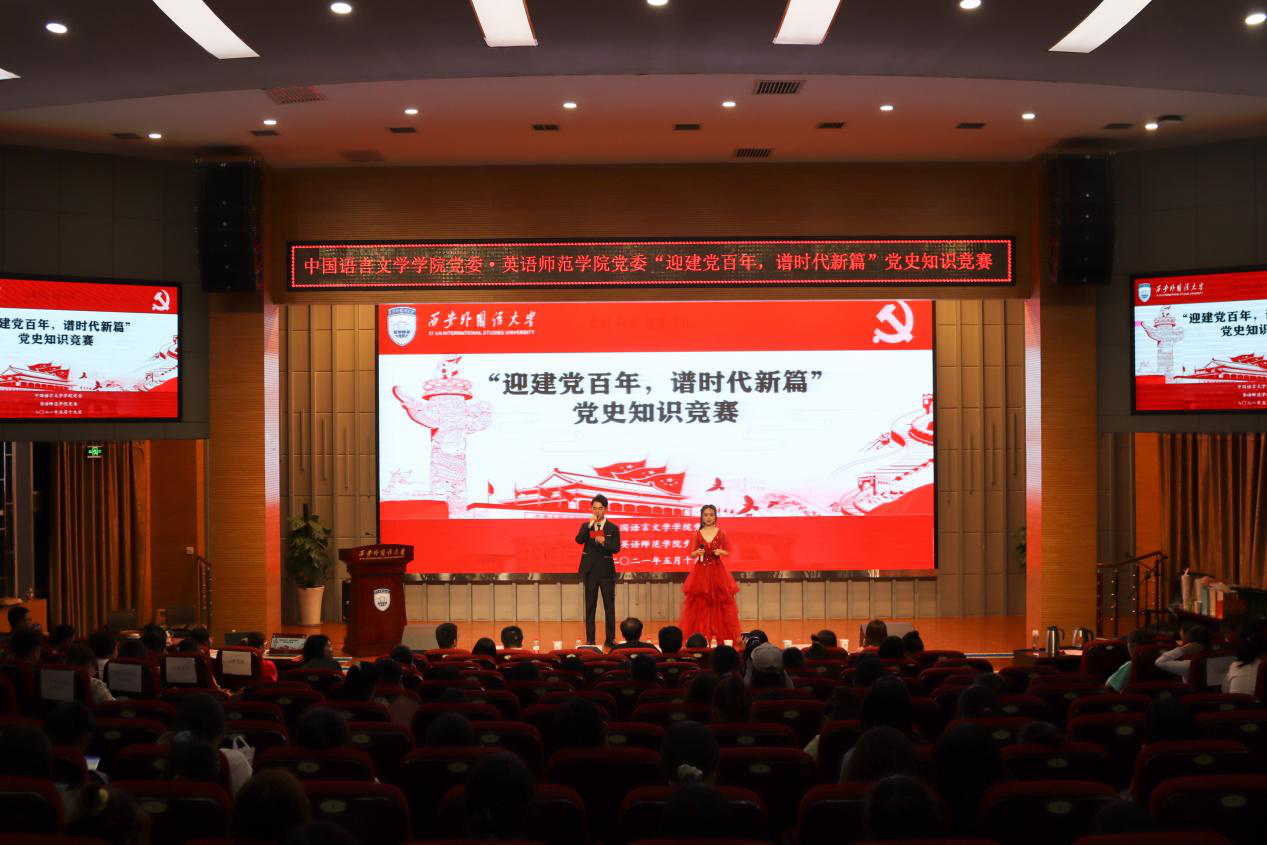 为庆祝中国共产党成立100周年,推进党史学习教育走深走实,努力打造党史学习教育的鲜活现场,av大平台 党委联合英语师范学院党委,于5月19日晚在JA111举办“迎建党百年,谱时代新篇”党史知识竞赛。校党委宣传部副部长郭富庭、av大平台 党委书记王刚、英语师范学院党委书记姚玮、av大平台 党委副书记王丹、英语师范学院党委副书记刘一静和各支部书记莅临现场。av大平台 党委委员邓艮教授、英语师范学院教工第一党支部书记金致远教授以及部分学生支部书记担任评委。两个学院学生党员及入党积极分子共300余人观看比赛。