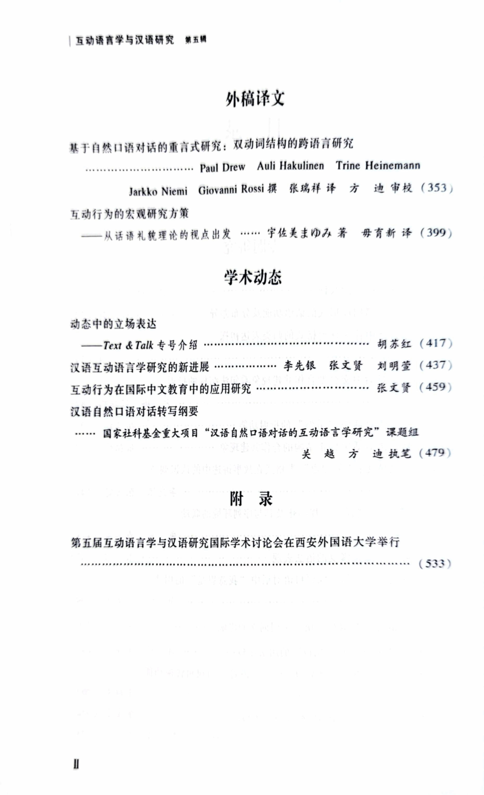 附录部分包含第五届互动语言学与汉语研究国际学术讨论会的会议报道及会议论文目录,为读者呈现了该领域研究的前沿动态,有助于深入了解汉语互动语言学的研究现状与发展趋势。