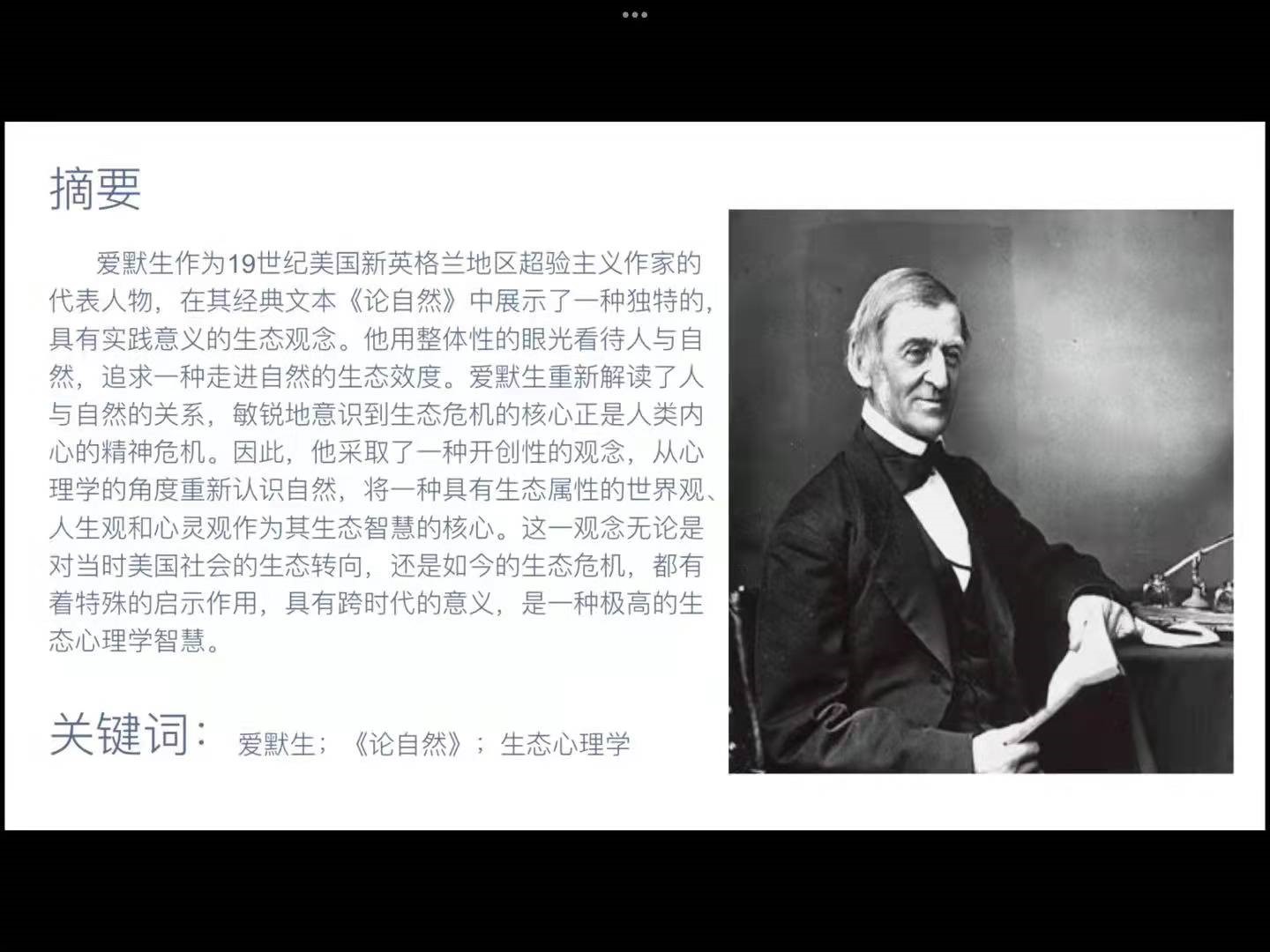 比较文学与世界文学专业研究生叶敏在《从瓦尔登湖到缅因森林——论梭罗自然书写中的荒野想象》一文中提出,作为梭罗守护的自然,荒野寄托了梭罗对荒野的浪漫想象,即通过对荒野的回归达到对人类野性精神和诗意文明的复兴。 比较文学与世界文学专业研究生杨雨晨《孤独的栖居地——雪莉·杰克逊<邪屋>的生态批评解读》小说通过展示“山屋”与孤独者的生存状况和精神状态,体现了雪莉·杰克逊对环境与人类精神之间关系的深刻思索,以及对孤独的个体命运的深切关怀。孙霄老师从生态理论的引入和论文关键词设计和逻辑架构等方面,对发言的两位同学论文中的亮点和不足都进行了点评。