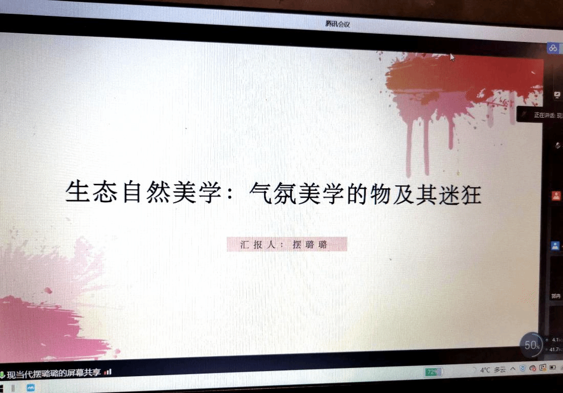 中国现当代文学专业研究生摆璐璐《生态自然美学:气氛美学的物及其迷狂》基于德国哲学家格诺特·波默关于气氛美学的理论展开论述,探讨气氛作为生态美学核心概念等价值和意义,分析感性经验和感性知觉作为生态自然美学主题的可能性。比较文学与世界文学专业研究生刘勇君《处所与认知:<雪落香杉树>的生态书写分析》从处所依附、处所标记和处所剥夺几个层面来分析《雪落香杉树》的生态书写特色,探究了特定自然区域对人的情感认知、生态身份认同及人性的发展问题。乔琦老师通过《阳光下的棕榈树》一诗,延续两位同学的发言内容,探讨了生态文学中的生态意识及其对我们的启示。