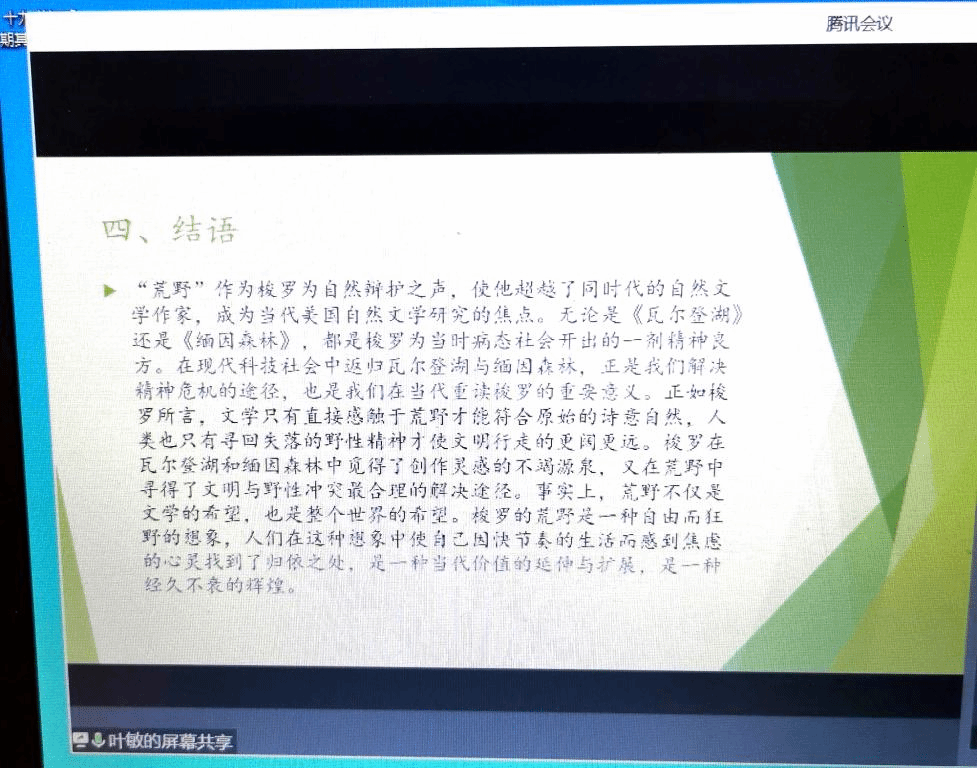 比较文学与世界文学专业研究生贾方白在以《<沙乡年鉴>中的“大地伦理”观及其所面临的困境》为题的分享中,以利奥波德的“大地伦理”和“生态中心主义”为基本原则,认为生态伦理学困境的突破,正在于从“大地伦理”必须走向“大地美德”的可能性。比较文学与世界文学专业研究生李晓雪以《论麦尔维尔的生态思想》为题深入分了麦尔维尔海洋文学作品中的生态意识,探索麦氏文学创作生态思想的追寻,勾勒出作家建设人类诗意家园的生态情怀,为解读麦尔维尔作品提供生态维度视角。孙旭老师肯定了两位同学的选题和表达,并在点评时提出,生态文学的研究仍需落在哲学维度,建议同学们参考海德格尔哲学,从存在论的角度落实生态文学研究。