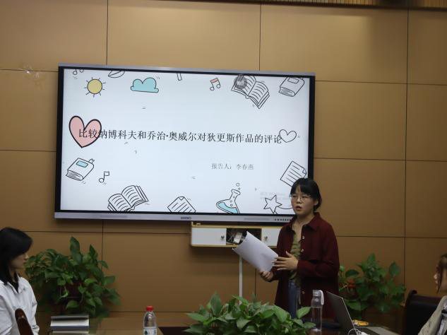 院长韩伟、教师孙霄、孙旭、邹莹、陈兰熏以及2022级比较文学与世界文学研究生参加此次读书会。本次会议由赵一帆主持,阚立珍、王乙、王欣子、石心仪、吴玉、周章、李春燕、赵佳欣、赵然九名同学分别从艾玛命运悲剧的凝视、《逃离》的三重主题、迷途的尤利西斯、跨文化视野下的中国古代悲剧探究、纳博科夫与乔治·奥威尔文学批评比较、日本文学中的女性书写研究,马克思文艺理论的影响研究、纳博科夫文字下的喻示以及阿克瑟尔城堡中的想象文学研究等为主题进行了详细的学术汇报。2020级研究生王铮向同学们分享了关于研究生课程学习、论文写作等方面的心得体会。
