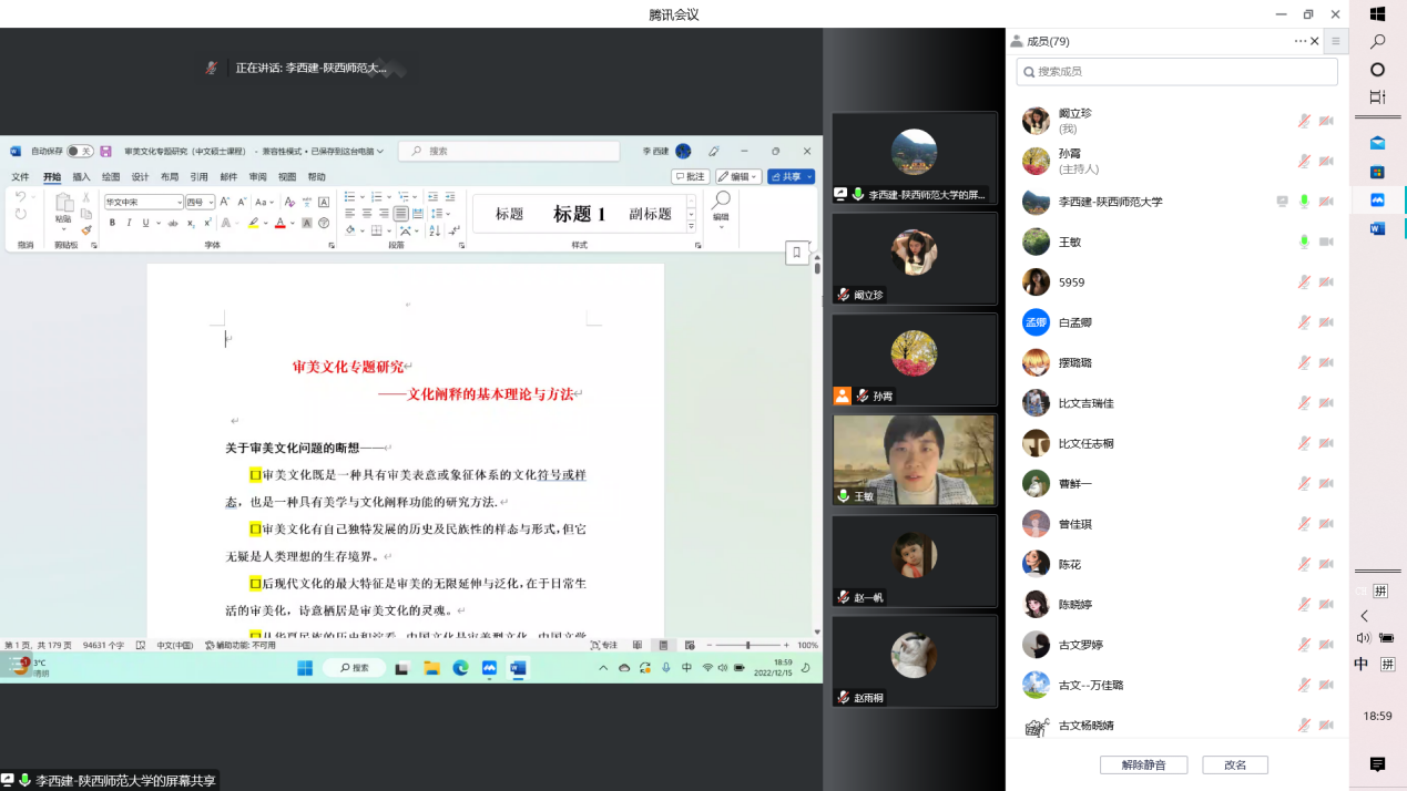 开展学术月系列讲座,邀请陕西师范大学文学院李西建教授开展“审美文化界说”的线上学术讲座。本次讲座由王敏教授主持,中文学院教师王敏、孙霄、邓艮、乔琦、刘欣、王鑫、赵婉彤、李泽涛及全体文学类研究生参加。