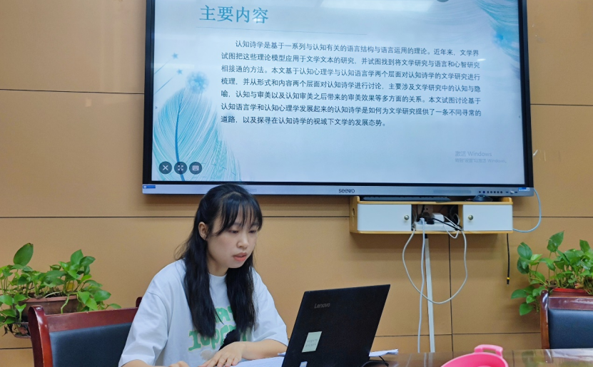 第四位发言的是2022级文艺学专业硕士研究生陈花,论文题目是《语言•审美•情感——浅论认知诗学下的文学研究》。论文基于认知心理学与认知语言学两个层面对认知诗学的文学研究进行梳理,并从形式和内容两个层面对认知诗学进行讨论,主要涉及文学研究中认知与隐喻,认知与审美以及认知审美之后带来的审美效果等多方面的关系。