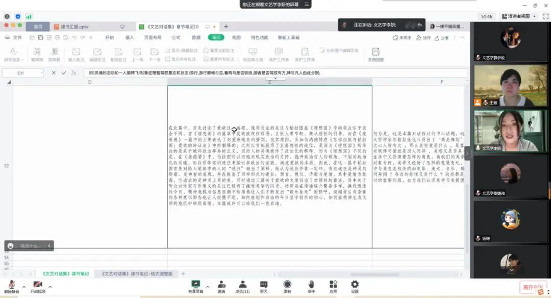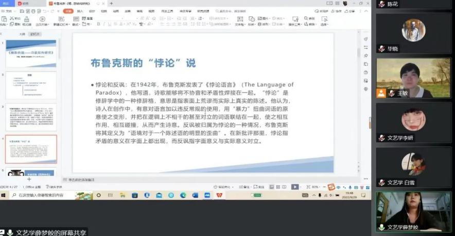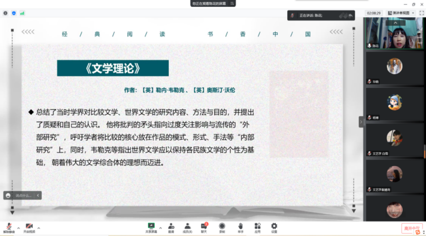 2022年9月29日晚,中文学院文艺学专业研究生新生读书会通过腾讯会议方式顺利举行。院长韩伟教授,教师王敏、杨博、毕晓以及文学类研究生参加了此次读书会。本次会议由王敏老师主持,李妍、薛梦皎、白雪、陈花、秦婧尧五位同学分别进行了读书汇报。