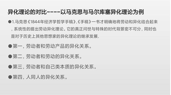 秦婧尧同学通过对比马克思在《1844年经济学哲学手稿》中的异化理论以及马尔库塞的科技异化理论,对异化理论在时代发展中的价值转向进行思考。从马克思的劳动者与劳动产品,劳动者与劳动,人的类本质,人的异化四个方面阐述展示了马克思的异化理论;马尔库塞则认为科技是异化的根本,展开了对科技理性的批判,在《单向度的人》中他提出了社会的全面“异化”和“单向度的人”。马尔库塞继承并发展了马克思的异化理论,并在其上进行了丰富与创新,但是他对于科技的全盘否定过于极端,也忽视了科技所带来的人类社会的进步。