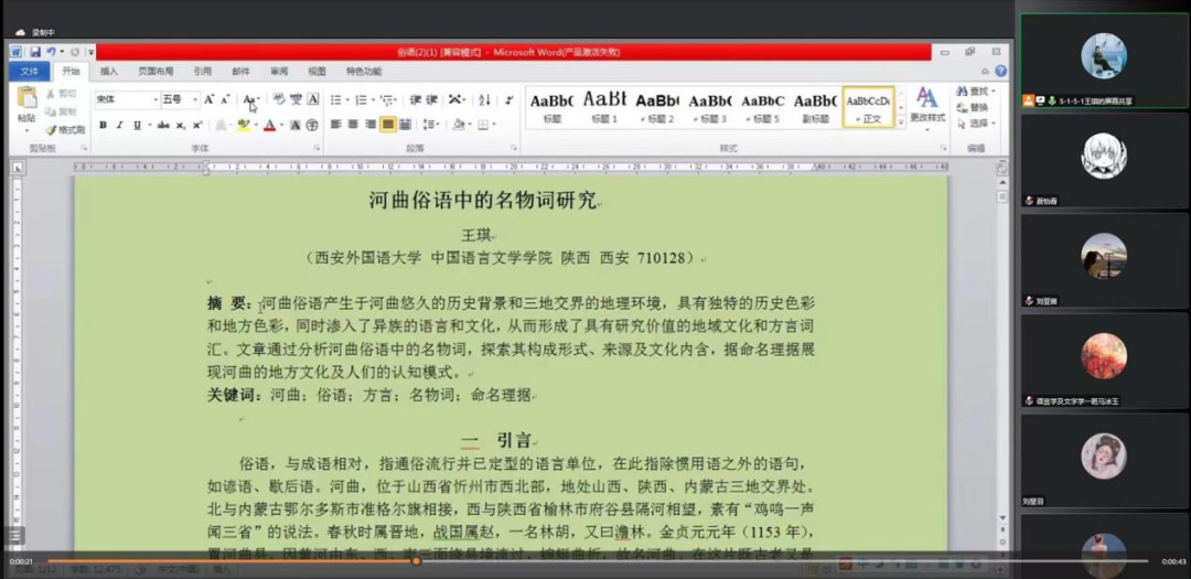 讲座伊始,王琪老师从文化语言学的角度对河曲地区方言中的名物词做了详细的训释,通过分析河曲俗语中的名物词,探索其构成形式、来源及文化内涵,据命名理据展现了河曲的地方文化及当地人的认知模式。她首先介绍了河曲地区的历史背景和地理位置,强调了河区俗语所具有的独特历史色彩和地方色彩,同时其中也渗入了异族的语言与文化,有着较高的探讨价值。其次王琪老师介绍了“名物词”这一术语并将河曲俗语中的具有特色的名物词分为身体、动物(禽兽、昆虫)、什物、称谓、食物、物产、天地、居所等八类进行详细的考证。之后,她详细展示了其对“骨殖(shi)”“眼睑骨”“耳信”胡燕儿“鸱怪子”“鸪鸪鸠”“路虎虎”“伙计”等词语的训释,其内容包含书证、声训及当地的风俗文化等各个方面。在此期间,王琪老师积极与相关方言区的同学们交流沟通,同学们结合自己所在方言区的用例提出自己的想法。最后,王琪老师与孙建华老师对方言本体研究与文化语言学视角下的方言研究的交叉点进行了探讨,对“骨殖(shi)”“耳信”“阳婆”“骚胡”等词的意义做了进一步的探究。