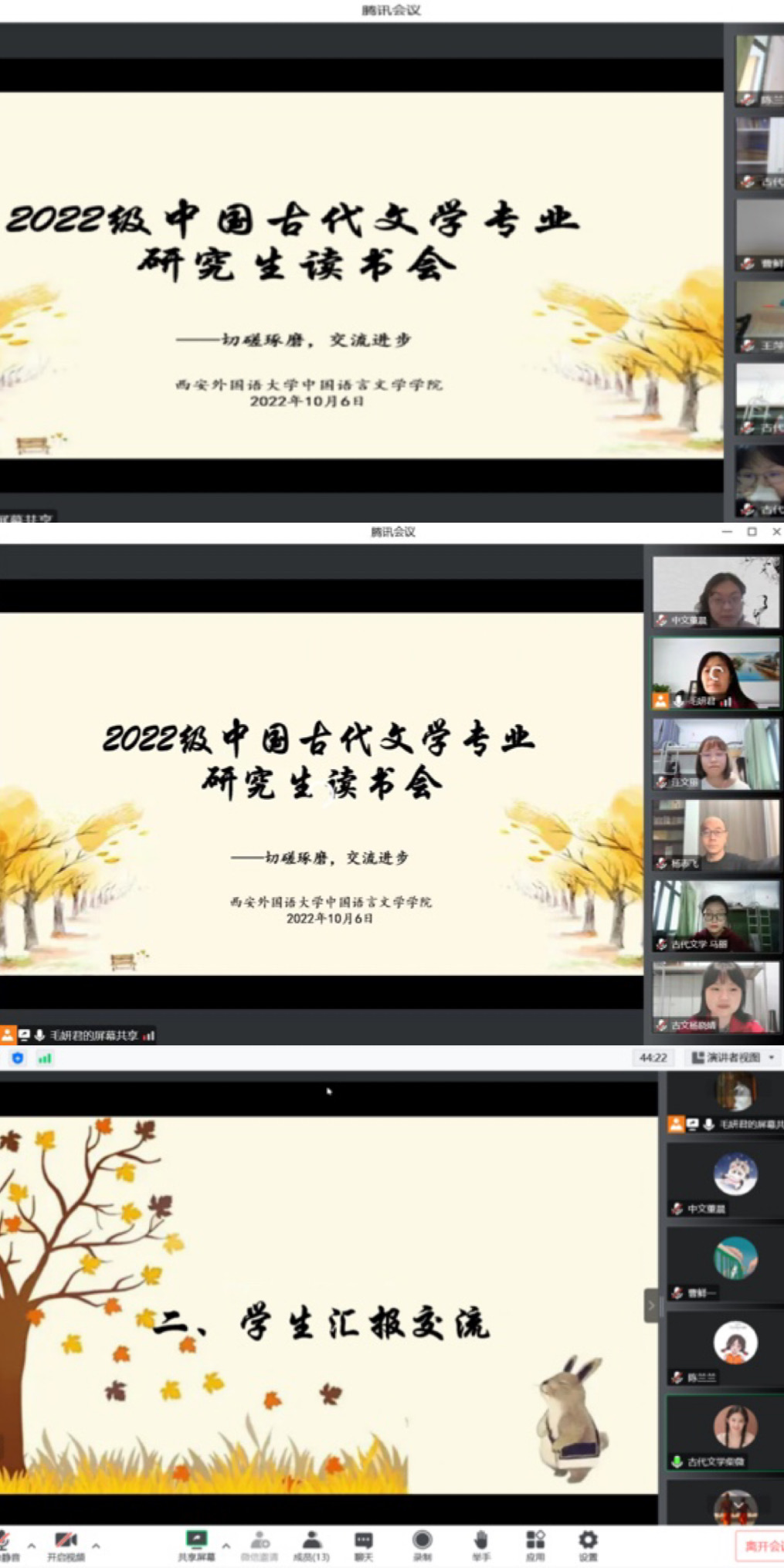 2022年10月6日下午,中文学院古代文学专业通过腾讯会议在线举办2022级研究生新生读书会。古代文学专业导师毛妍君、王萍、杨志飞、董晨以及2022级古代文学专业的九位研究生同学参加了此次读书会。会议由毛妍君老师主持,董晨老师致开场辞,曹鲜一、柴薇、陈兰兰、马丽 、罗婷、汪文丽、杨晓婧、张蓝丹、张明慧九位同学围绕“假期阅读感受最深刻的”这一主题进行了阅读分享。