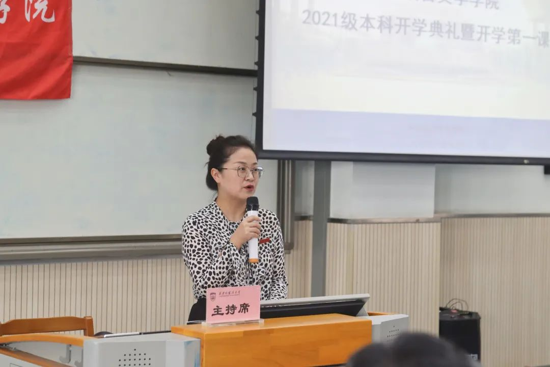 典礼在庄严肃穆的国歌声中拉开帷幕。院长韩伟在致辞中期望同学们要在生活中增进团结、促进友谊,在学习中培养“一手好文章、一手漂亮字、一口普通话、一口好外语、一副好仪表、一副好口才”的“六个一”专业素养,在大学四年不懈拼搏中书写人生华章。他同时强调,全体2021级新生要以“致四年后自己的一封信”为人生航标,树立远大理想,高扬梦想之帆,紧握奋斗之桨,既要仰望星空又要脚踏实地,让奋斗成为青春最亮丽的底色。