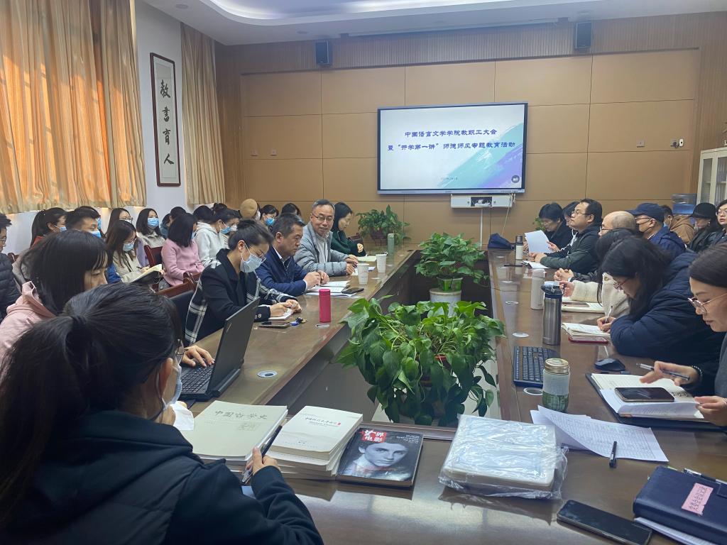 2022年3月6日下午,中国语语言文学学院在JE126院会议室举办了全院教职工大会暨“开学第一讲”师德师风专题教育活动,学院党政领导及全体教职工参会。会议由院长韩伟主持。