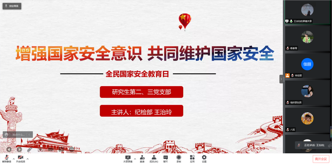 通过主题班会、主题党日和社团活动等方式,组织学生开展以“维护国家安全,构建和谐校园”为主题的线上线下学习活动。通过播放视频、学习文件、研讨交流等形式多样的国家安全教育活动,切实增强广大师生自觉维护国家安全意识。