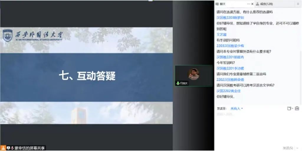 主动亮相,构建互信。本次新生见面会的召开在推动学院师生沟通信任,加强新生入学教育、思想政治教育等方面发挥着重要作用,期待大家能早日在美丽的西外校园线下相遇,也衷心希望中文学院2022级新同学们能乘风破浪、不负韶华,勇毅笃行、奋斗拼搏,顺利开启充实精彩的大学生活新篇章!
