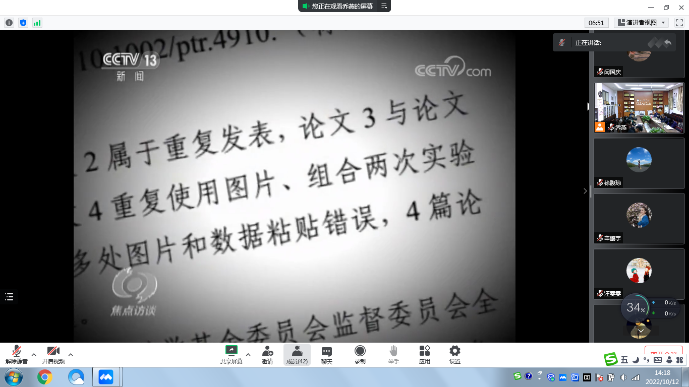 会上,全体教职工集体观看了《无信不立系列报道 对“科研不端”零容忍》,大家一致表示要始终坚守科研诚信底线,做到知晓科研伦理、培养科研道德,坚决杜绝学术不端行为。随后副院长董佳传达学校《关于开展2022年度科研诚信教育宣传月活动的通知》文件精神,并领学《哲学社会科学科研诚信建设实施办法》。副院长杨志飞领学《高等学校预防与处理学术不端行为办法》,党委副书记王丹领学《学位论文作假行为处理办法》,科研秘书苟长欣领学《发表学术论文“五不准”》《av大平台
