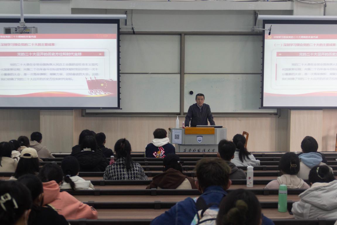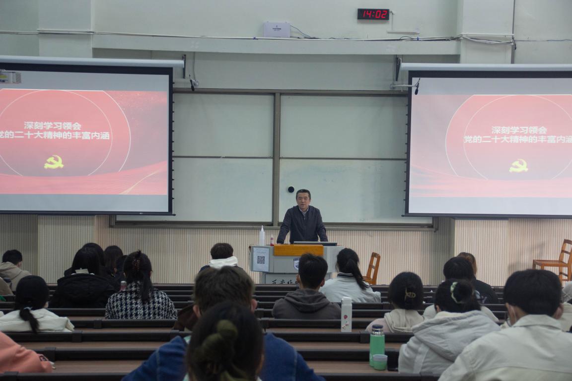 党委书记王刚为2022级学生讲授“学习贯彻党的二十大精神,做民族伟大复兴的践行者”为主题的“开学第一课”,辅导员罗婷及2022级学生参加。